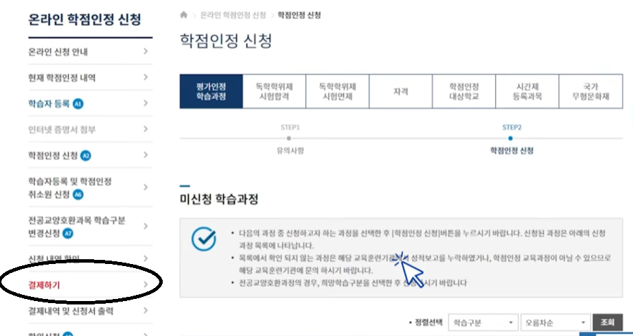 4.왼쪽 결제하기 클릭 후 학점인정신청 수수료 결제까지만 해두시면 됩니다 (1학점당 1,000원의 수수료가 발생)