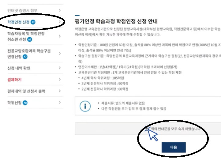 3.왼쪽 학점인정신청 클릭 후 이수한 과목 체크 후 학점인정신청 클릭
