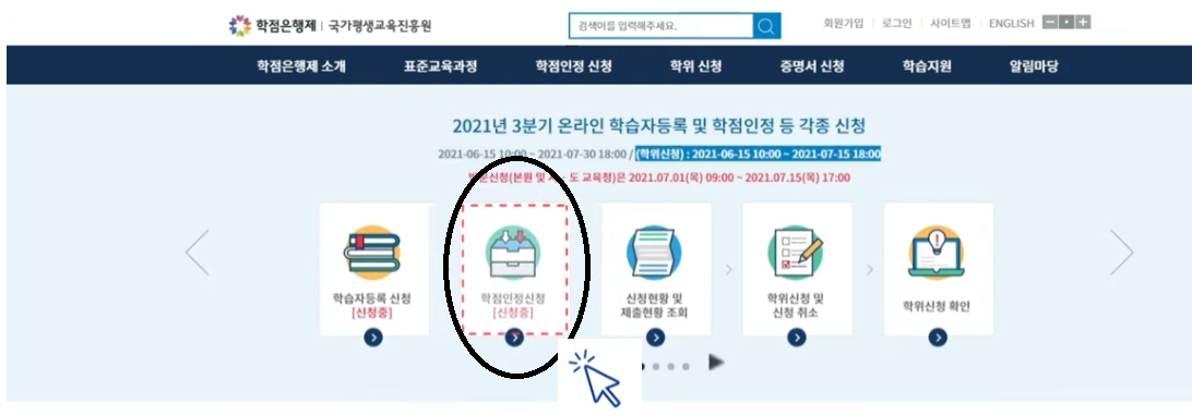 1. 로그인 후 아래 사진과 같이 학점인정신청 클릭